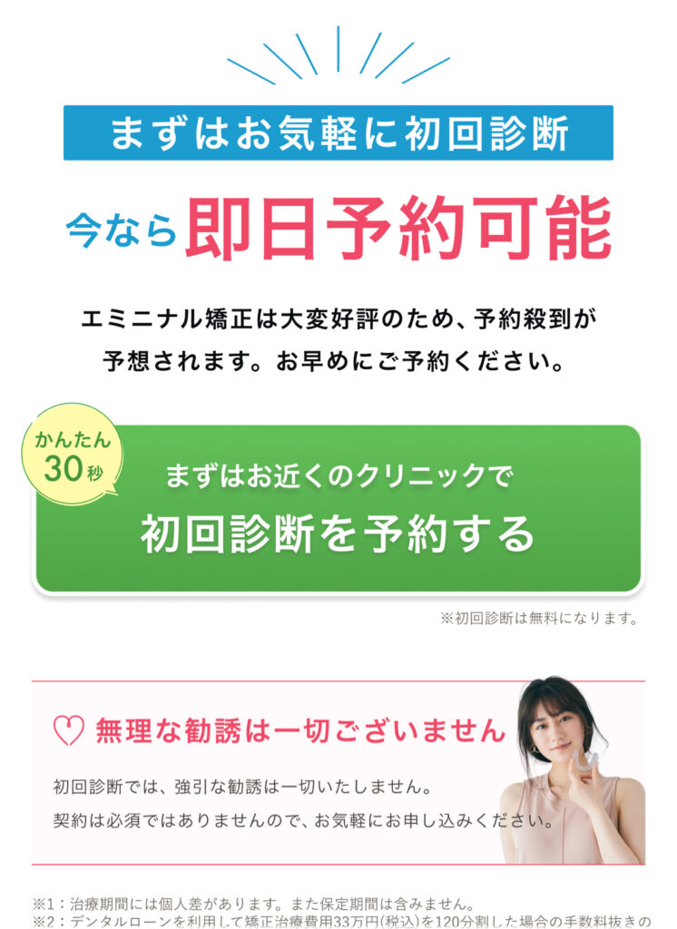 エミニナル矯正の公式サイトには、「無理な勧誘は一切なし」という記載があります。