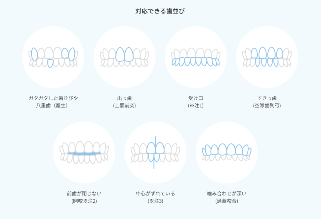 • 歯並び全体には対応していないため、Eラインを目指すのが難しい